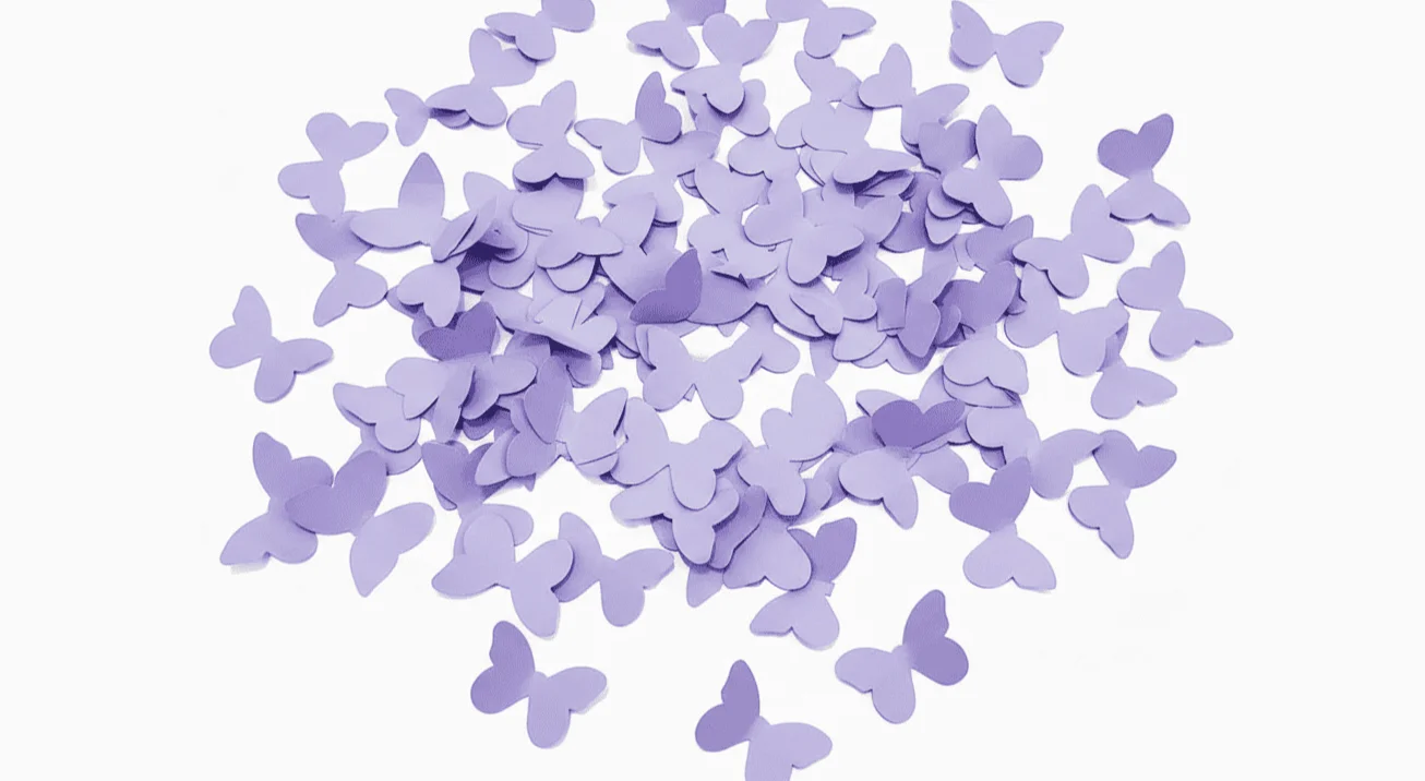 Confeti de papel mariposa lila de Confetix Impacto visual diferenciador que fortalece el branding Calidad uniforme y producción controlada